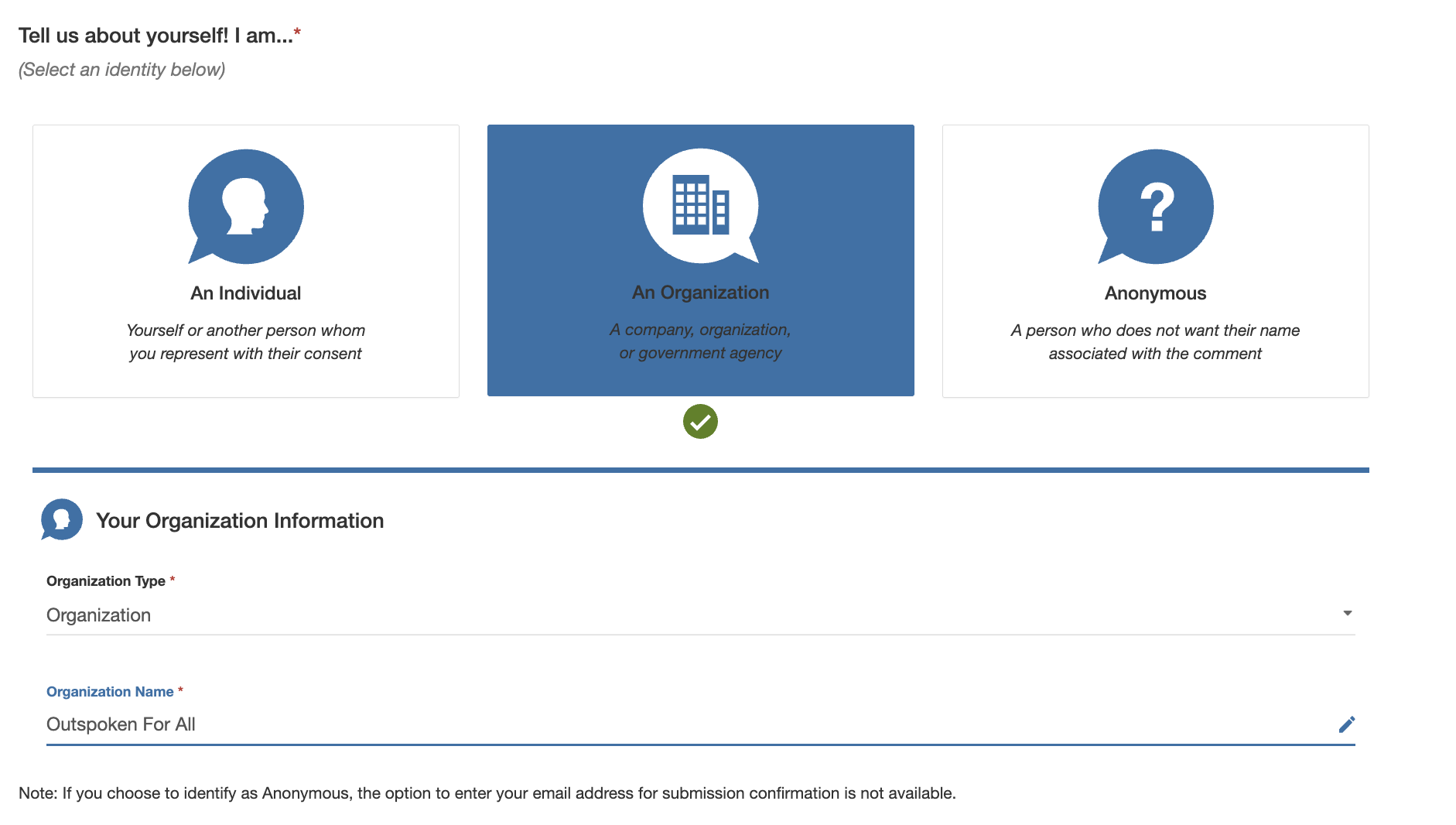STEP 5: Tell the EPA we sent you! Select “Organization” and enter “Outspoken For All”